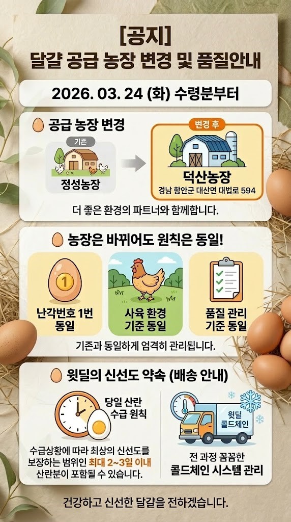 ■ 달걀 공급 농장 변경 안내 기존 정성농장에서 산란한 난각번호 1번 달걀을 공급해 드렸으나, 2026년 3월 24일(화) 수령분부터 덕산농장에서 산란한 달걀로 공급 농장이 변경됩니다.
